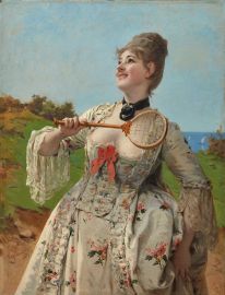 Le due opere sono state studiate per essere affiancate così da simulare, sia per il taglio compositivo che per la gestualità, una vera partita di volano giocata all’aperto, dando l’impressione a chi guarda di essere vero spettatore della partita in corso tra le due sorridenti fanciulle. L’ammiccante rievocazione settecentesca orchestrata da Pagliano in questo delizioso pendant ripropone con il fare minuto, in punta di pennello, generalmente associato a simile scene di costume, la resa delle trine degli abiti, delle fruscianti sete e dei nastri di velluto delle due sorridenti fanciulle, che testimonia la volontà di esibire i virtuosismi calligrafici dell’artista, attento alla cura di ogni dettaglio. Il paesaggio di fondo, i cespugli, il mare e la veletta all’orizzonte sono risolti con fare più sciolto, evidenziando quelle soluzioni d’ascendenza naturalista che il pittore aveva sperimentato nelle ricerche en plein air condotte a Griffa, sul lago Maggiore.