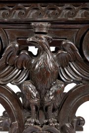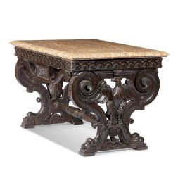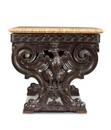 in legno di noce scolpito, intagliato e patinato, con piano rettangolare in alabastro listato. Sostegni composti da due elementi scolpiti a volute architettoniche e caratterizzati da grandi insegne di blasone costituite da aquila coronata, cm 88x131x97
