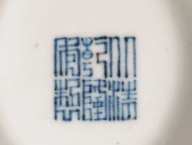 in porcellana smaltata di verde all’esterno all’interno bianco e blu con decoro di fiori e rami, sotto la base marchio in blu sottosmalto; diam. cm 20,4