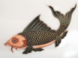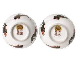 in porcellana decorata all’esterno e interno con pesci, marchio di buon augurio sotto la base; diam. cm 11 e cm 11,5 (2)