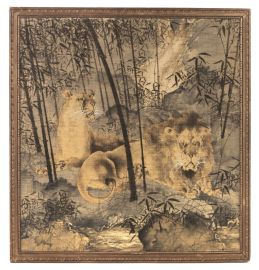 日本十九世纪 《双狮图》《灵猴图》设色绢本