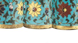 in cloisonné decorati con fiori e foglie, reca marchio sulla base; alt. cm 4,6 (2)