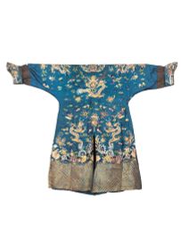 in seta fondo blu con draghi dorati a rilievo, nuvole e oggetti preziosi; cm 133