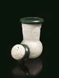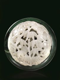 in giada bianca lavorata con paesaggio, coperchio lavorato e traforato con fiori e foglie; alt. cm 15