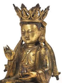 in bronzo dorato raffigurante Buddha con corona; alt. cm 19