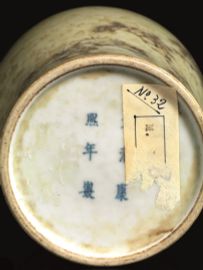 a forma di cupola, a fondo chiaro dipinto con rosso sotto smalto, nella parte centrale alberi fioriti e montagne e un drago nel collo allungato, completo di base in legno traforato; alt. cm 24
