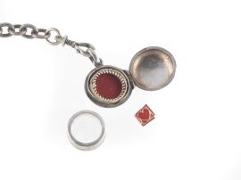 cassa in metallo, quadrante bianco con numeri romani, accompagnato da una chiave di carica e un porta reliquia recante un piccolo libro rosso con inciso "Ti Amo" in diverse lingue. Diam. orologio mm 40, lungh. chatelaine cm 21