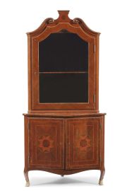 lastronate in varie essenze, corpo superiore a uno sportello in vetro di forma sagomata terminante con cappello a doppia voluta a inquadrare motivo di fiore entro stella, corpo inferiore a due sportelli intarsiati con motivo di fiore entro stella tra molteplici riserve, gambe anteriori mosse su piedini in bronzo dorato, cm 227x75x75
