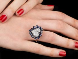 al centro un cuore impreziosito da diamanti taglio brillante per ct 0.50 circa, circondato da una fila di zaffiri taglio navette per ct 2 circa, mis. 13, gr 7