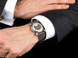 cassa in acciaio, fondello a pressione, quadrante bicolore, numeri romani applicati, secondi al 6, anse a goccia, movimento a carica manuale. Diam. mm 34