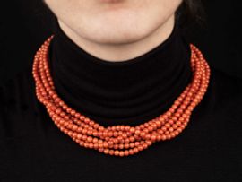 a sette fili intrecciati di sfere in corallo di mm 4 circa, con fermatura in oro giallo , punzoni 750 e del fabbricante, lungh. cm 41,50, gr 101