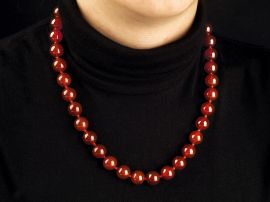 ad un filo di sfere in corniola di mm 12 circa, fermatura a moschettone in oro giallo, punzoni 750 e del fabbricante, lungh. cm 49, gr 87