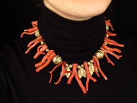 composta da un filo di rami in corallo, con distanziali a sfera e forma di foglia in oro giallo satinato e sbalzato, punzoni 750 e del fabbricante, lungh. cm 39, gr 121