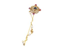 A PEARL RUBY AND TOURMALINE PIN IN GOLD