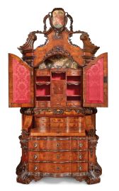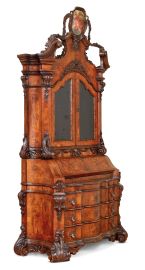 in noce e radica di noce. Il corpo superiore a due sportelli specchiati di forma mistilinea celanti all’interno uno sportello tra cassettini e vani a giorno, inquadrati in alto e in basso da racemi vegetali e ai lati da lesene scolpite con capitello a voluta e base a ricciolo impreziosita da foglia rocaille, sulle quali poggiano due volute modanate che inquadrano la ricca cimasa sagomata sormontata da cartella dipinta con motivo di angelo, collegata alle volute attraverso festoni di foglie. Il corpo inferiore presenta ribalta bombata celante sei cassettini mossi disposti su tre colonne, cui seguono tre cassetti di linea spezzata inquadrati ai lati da paraste con volute fogliacee alle due estremità sormontate in alto da conchiglia rocaille a terminare nella parte inferiore in piedi a ricciolo, fianchi di linea concava inquadrati sul retro da medesime paraste terminanti in piedi a ricciolo; maniglie e bocchette in bronzo dorato; tutta la superficie ornata da riserve filettate a inquadrare specchiature in radica, cm 282x150x64