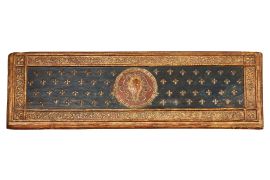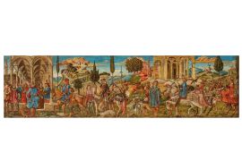 in noce intagliato e lumeggiato in oro, dipinto a tempera e con decorazioni a rilievo in pastiglia, coperchio profilato da fascia a ramages a inquadrare al centro uno stemma entro gigli dorati su fondo blu, fianchi ornati da stemmi e festoni, fronte inquadrato da due paraste con candelabre a rilievo interamente dipinto con corteo rinascimentale, forse la partenza per una caccia al falcone, sullo sfondo di un ampio paesaggio con architetture, cm 40x123x43