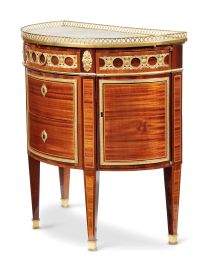 a demilune, lastronata in legno satiné e amaranto con profilature in bosso e montature e applicazioni in bronzo dorato, piano incassato in marmo bianco inquadrato da ringhiera traforata, fascia sottostante al centro della quale si apre un cassetto ornata da fregio continuo di doppio nastro intrecciato ornato da fiore alternato da palmette poste in corrispondenza delle lesene che inquadrano i due cassetti sul fronte, senza traverse e profilati da cornicetta dorata a fogliette lanceolate ricorrenti, due sportelli laterali analogamente profilati, quattro gambe troncopiramidali con piedini a dado in bronzo dorato, stampigliata sul retro R. Lacroix e JME, cm 89x80,5x45