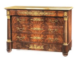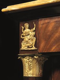 in mogano e piuma di mogano con applicazioni in bronzo dorato e piano in marmo giallo con bordo a becco di civetta; fronte leggermente rientrante a tre cassetti sormontati da un cassetto più sottile inquadrati ai lati da semicolonne con capitelli a lunghe foglie alternate a palmette con fiori e sormontate da dado decorato da applicazione dorata raffigurante Venere e Amore; il primo cassetto centrato da grande fregio a fiore centrale dal quale si diparte un ampio motivo a palmetta che si porta ai margini esterni, maniglie a motivo di due ghiande collegate da un festone e bocchette inquadrate da busti alati dal cui corpo si dipartono ramages vegetali in atto di sostenere cornucopie; fascia inferiore impreziosita da applicazione in bronzo dorato raffigurante il Carro di Amore, cm 92,5x130x64