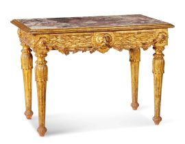 in legno intagliato e dorato, piano incassato in breccia violetta profilato da cornice modanata, fascia sottopiano a motivo continuo di foglie sovrapposte e ricorrenti a inquadrare al centro un mascherone entro cornice mistilinea dalla cui bocca fuoriescono due tralci fioriti che si portano sui lati, angoli centrati da fiore a rilievo dai quali si dipartono le gambe troncoconiche scanalate e rastremate con estremità superiore a stretto nodo perlinato seguito da decoro vegetale, cm 91x126x70