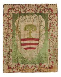 in seta a fondo verde con ampia bordura policroma a volute vegetali e fiori, decorati al centro con insegna nobiliare costituita da stemma troncato con quercia e fasciato di sei pezzi di rosso e argento, incorniciata da fregio a volute vegetali, cm 328x270