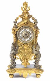 in bronzo brunito e dorato, di forma architettonica con cassa sostenuta da quattro figure di arpie scolpite a tutto tondo poggianti su base mistilinea ad angoli stondati ornata da fregio continuo di fiori entro riserve circolari, quadrante con numeri romani in smalto bianco entro riserve sagomate e doppio foro di carica dal quale si dipartono drappi ornati da volute fogliacee sul fronte e da faretra tra nastri sui lati per terminare in due volute che inquadrano elemento fogliaceo, e sormontato da timpano centinato con vasi angolari a inquadrare volute che sostengono una figura femminile con ali di farfalla e grande copricapo piumato, su piedini a sfera schiacciata, meccanismo siglato H&F PARIS 2742, cm 78x29x38