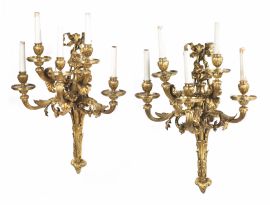 in bronzo dorato, fusto in foggia di foglie di acanto sovrapposte trattenute all’estremità inferiore da nodo da cui pende un grappolo di uva che proseguono in alto con palmette anch’esse sovrapposte a sostenere i cinque bracci disposti su due palchi in foggia di volute e impreziositi all’attacco da grappoli d’uva, piattello di forma circolare e bobeches cesellati a motivi fogliacei, fusto terminante con vaso fiammato sormontato da fiocco i cui nastri scendono sui lati, cm 61x51x32