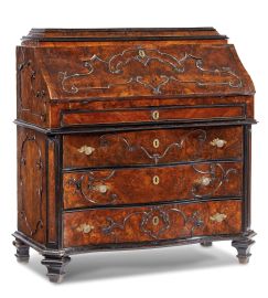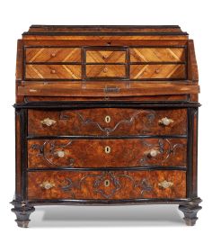 lastronata in noce e radica con profilature in legno ebanizzato, pianetto di forma rettangolare con due cassettini su lati, fronte di linea lievemente mossa con ribalta celante sei cassettini disposti su tre colonne cui seguono quattro cassetti dei quali il primo più sottile, fronte e fianchi interamente ornati da cornici a rilievo a creare riserve mistilinee, piedini di forma troncopiramidale sagomate, cm 122x116,5x61