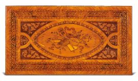 lastronata e intarsiata in legni pregiati, piano di forma rettangolare ornato da medaglione con trofei di strumenti musicali al centro con rami fogliacei agli angoli entro cornice a volute fogliacee ricorrenti, scorrevole a celare tablette intarsiata con rosone che, anch’essa scorrevole, mostra all’interno un vano a giorno inquadrato su tre lati da cassettini, fascia sottopiano a cornice dentellata sotto la quale è un fregio a girali trattenuti sui fianchi da puttini con medaglioni centrali raffiguranti personaggi di profilo, fronte a due cassettini per lato ciascuno ornato da riserva rettangolare a inquadrare ramages vegetali che si dipartono da due delfini divergenti con code incrociate, con interno ornato a rosone entro cornice a nastro ritorto, fianchi decorati da riserva centrale a elemento vegetale tra volute fogliacee centrate da fiore mentre, sul retro, il decoro del fronte è ripetuto in corrispondenza dei cassetti, con l’aggiunta di un pannello centrale dove rabeschi vegetali si sviluppano da un motivo a vaso centrale, lesene angolari decorate a candelabre su gambe troncopiramidali, cm 83x125x68
