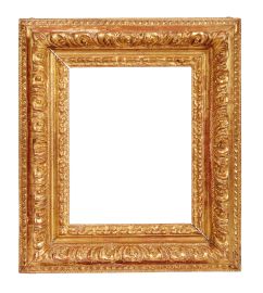 in legno intagliato e dorato, battuta a mezze foglie rivolte verso l’interno cui segue gola che si porta su fascia aggettante intagliata a unghiature oblique che dal centro si portano sui lati, gola diritta si porta su bordo digradante a muro intagliato a cerchietti sovrapposti che dal centro si dirigono verso gli angoli, doratura a guazzo in oro zecchino con preparazione a bolo; ingombro cm 31,8x27,5, luce cm 19,3x15,2