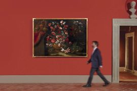 Insolita l’ambientazione notturna, che non riscontriamo nelle altre sue composizioni all’aperto fin qui note: una scelta atta a far risaltare la brillante cromia dei suoi fiori recisi, anemoni e tulipani in tutte le gradazioni del rosa, le pieghe sontuose del panno con la bordura dorata e i bagliori metallici.