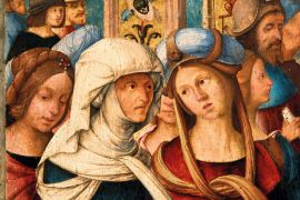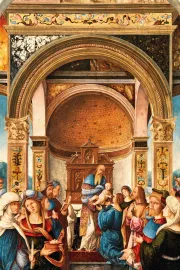 Sono appunto i motivi classicheggianti liberamente rielaborati nei modi più eccentrici ed esaltati dalla vivace policromia sul fondo dorato a caratterizzare il nostro dipinto, ripetuti sulle lesene e gli archi delle campate dell’improbabile loggiato “all’antica” ove ha luogo la presentazione del Bambino. Al rigore geometrico dello spazio prospettico, sottolineato dalle specchiature di marmi variegati, fa contrasto il gusto nordicizzante delle figurine, forse esemplato su modelli incisi non rintracciati, evidente nelle vesti e nelle acconciature delle protagoniste femminili, come nel profilo aguzzo del personaggio anziano a sinistra dell’altare. Motivi che ritroviamo testualmente nella Visitazione milanese e, declinati in modo appena diverso, nella predella con miracoli di Sant’Antonio di Francesco Zaganelli a Berlino, Gemäldegalerie e in altre opere dell’artista romagnolo.