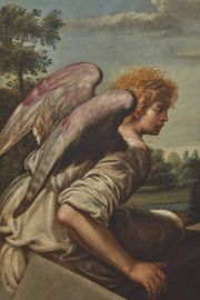 Innegabile è infatti la relazione tra il nostro angelo giovinetto seduto su un lato del sarcofago e quello che nelle diverse versioni del Sacrificio di Isacco, il tema preferito del pittore lombardo, interviene a bloccare il gesto del Abramo, indicandogli la nuova vittima sacrificale: vicinissimo il profilo affilato, la chioma scomposta – quasi una sigla del pittore – le ali appena venate di rosa, le pieghe replicate della veste.