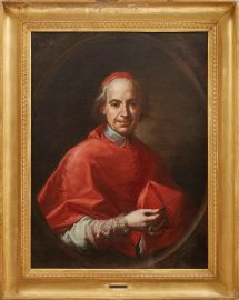 Il dipinto qui offerto è appunto il modello di quel ritratto, trasposto in mosaico sulla base di un disegno di Ignazio Stern che, con ogni evidenza, si limitò ad aggiornare l’aspetto del cardinale imbiancandone i capelli e ammorbidendo i contorni del viso. Altrettanto vivace è però lo sguardo, oltre che identica la posa e le pieghe della mozzetta secondo il modello del ritratto cardinalizio messo alla moda dal Baciccio nell’ultimo quarto del XVII secolo.