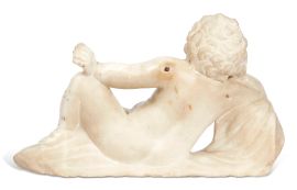 in marmo raffigurata come putto disteso di un drappo con il braccio destro poggiato su una clessidra, cm 22,5x37x11