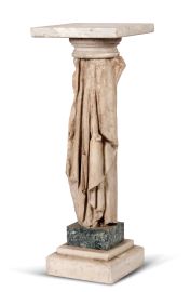 in marmo raffigurante imperatrice romana con testa in porfido rosso e busto in breccia su piedistallo scanalato di forma circolare in marmo bianco, alt. cm 50, poggiante su colonna in marmo bianco di gusto eclettico con fusto scolpito in foggia di panneggio, su duplice base in marmo verde delle Alpi e bianco, cm 78,4x27,2x29,3
