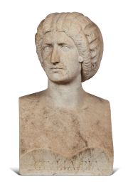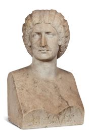 in marmo raffiguranti Giulio Cesare e Giulia Pia come riportato nell'iscrizione alla base, Giulio Cesare cm 61x33x25, Giulia Pia cm 59x33,5x26