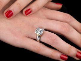 in platino e oro giallo 18kt, diamante taglio ottagonale di ct 2.40 circa, mis. 13, punzoni PLAT e del fabbricante, gr 15. Corredato di certificato IGN del 16/01/2020 attestante le caratteristiche.