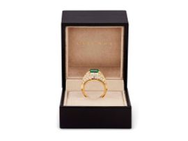 in oro giallo 18kt, smeraldo taglio ottagonale di ct 1.83, diamanti taglio brillante e baguette per ct 2.30 circa, mis. 15, firmato "Bulgari", punzoni, gr 10. Corredato di scatola