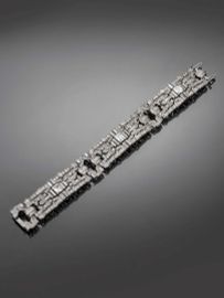 in platino, tre diamanti taglio smeraldo taglio smeraldo per ct 3.45 circa, diamanti taglio baguette, smeraldo e brillante per ct 21 circa, lungh. 18 cm, punzoni francesi di importazione, gr 68