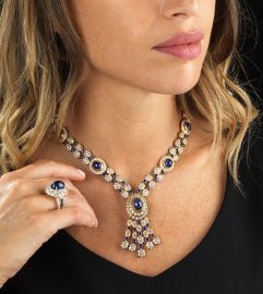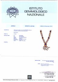 in oro giallo 18kt, sette zaffiri taglio cabochon per ct 31 circa, diamanti taglio brillante per ct 13 circa, colore G, purezza Vvs/Vs, lungh. 52 cm, gr 113. Corredata di certificato IGN del 28/11/2019 attestante l'origine geografica degli zaffiri e di certificato IGC del 24/01/2019 attestante le caretteristiche dei diamanti.