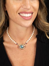 PEARL YELLOW GOLD NECKLACE WITH AQUAMARINE RUBIES AND DIAMONDS