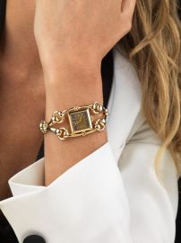 cassa e bracciale in oro giallo 18kt, quadrante ad occhio di tigre, movimento al quarzo, firmato "GUCCI", punzone 750, lungh. 15 cm, gr 87. Corredato di scatola.
