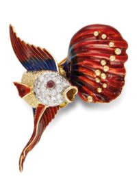 KUTCHINSKY 1967 DIAMOND AND ENAMEL YELLOW GOLD BROOCH SHAPED AS A FISH