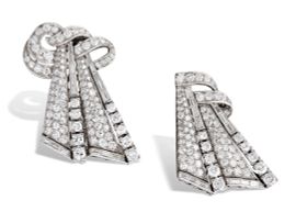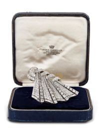 composta da due clip amovibili in platino, diamanti taglio brillante e baguette per ct 9.90 circa, montatura della spilla in oro bianco 18kt, punzoni 750 e PT, dim. 65x45 mm circa, gr 44. Corredata di scatola.