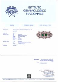 in platino, smeraldi taglio ottagonale e carré per ct 1.80 circa, diamanti taglio brillante, baguette e carré per ct 8.50 circa, dim. 50x25 mm, punzone francese raffigurante la testa di un cane, gr 16. Corredata di certificato IGN del 18/02/2020 attestante le caratteristiche e l'origine geografica.
