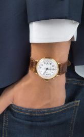 cassa a cerniera in oro giallo 18 kt con anse fisse, quadrante bianco in porcellana con stampa a due colori, vetro plastica, movimento a carica manuale con funzione cronografo, cinturino in pelle con fibbia. Diam mm 39.