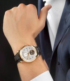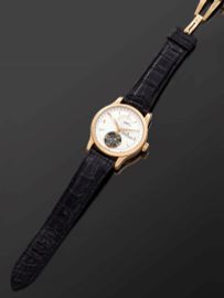 cassa avvitata in oro rosa 18 kt con fondello trasparente, movimento a carica automatica cal 978 con tourbillon e massa oscillante in oro 22 kt, quadrante argentè con indicazione doppio fuso orario e datario a lancetta, Corredato di fibbia pieghevole originale in oro rosa 18 kt, astuccio, garanzia e libretti. Orologio probabilmente mai indossato. Diam mm 41