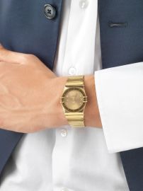 cassa di forma in oro giallo 18kt, fondello a scatto con logo Constellation, corona marcata Omega, quadrante colore oro, vetro minerale prima serie con serigrafia interna, movimento al quarzo ref. 1431, bracciale in oro giallo 18kt,ocn chiusura marcata omega ref. 398.0866. Diam. mm 35, peso compl 99 gr. circa, lungh tot 18cm