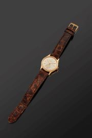 cassa in oro rosa 18kt, quadrante indelebile argentè con riportato il nome del rivenditore ufficiale “Freccero”, indici applicati, fondello a vite, movimento a carica manuale, cinturino in pelle con fibbia originale in oro giallo 18kt, vetro plastica. Diam. mm 31