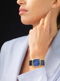 cassa di forma squadrata in oro giallo 18kt, corona marcata, quadrante blu con personalizzazione del concessionario Patek Philippe, Hausmann & Co. di Roma, vetro minerale, movimento a carica manuale cal 175, cinturino pelle con fibbia originale in oro giallo 18kt. Diam. mm 28x28